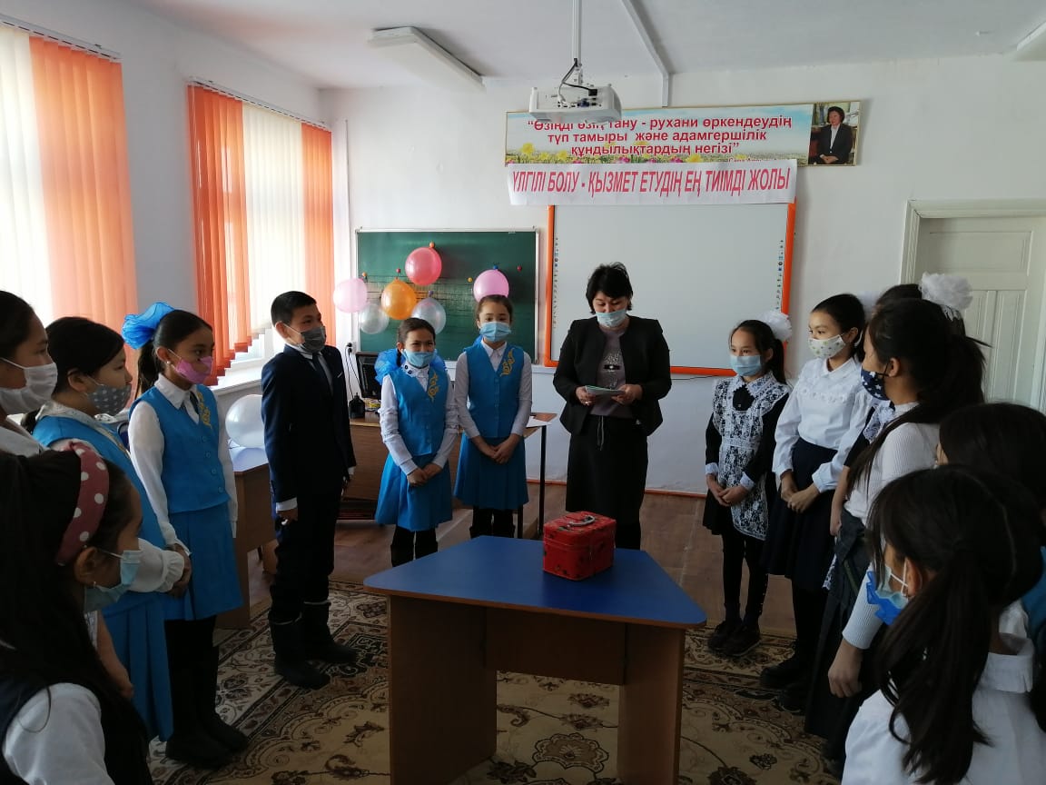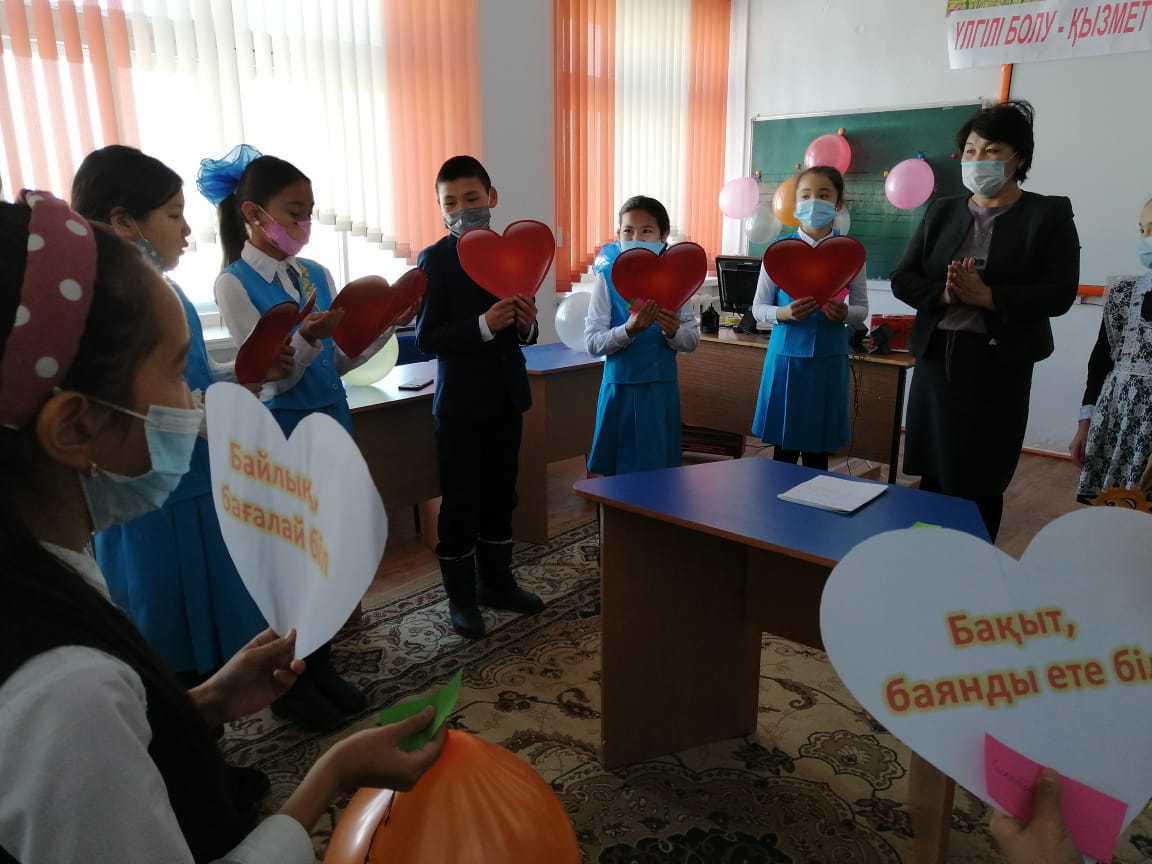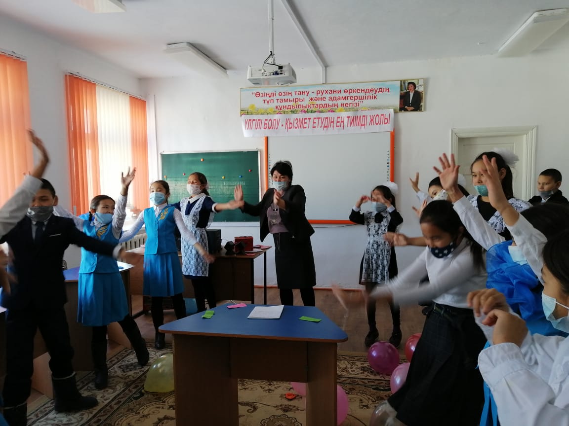 5-7 сыныптар арасында Қалмағанбетова Сәуленің ұйымдастыруымен «Үлгілі болу – қызмет етудіңең тиімді жолы» атты тренинг өткізілді. Тренинг барысында жалпыадамзаттық құндылықтар туралы өз ойларын ортаға салды.Сыйқырлы қобдиша ойыны ойнатылды. Әр бала қобдишаның ішіндігі жазылған адамгершілік қасиеттер жазылған сыйлықты достарына сыйлады. Осы сыйлықты алған оқушыны лайықты деп таныса, қошемет көрсетілді. Жұректерге жазылған әр түрлі жақсы қасиеттерді қасындағы оқушыларға ұсынды.