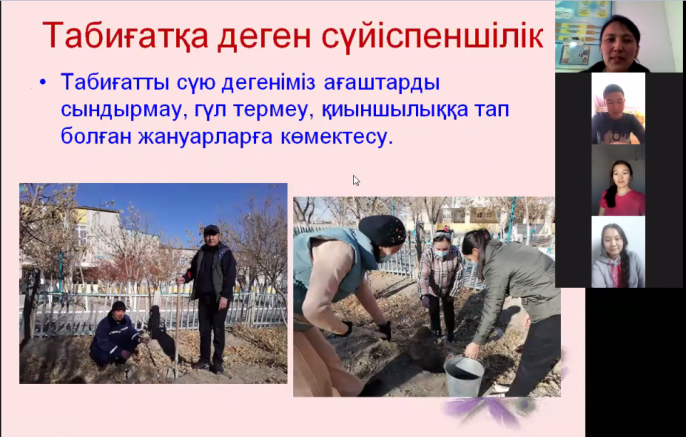 «Сүйіспеншілік –адамның басты қасиеті, ақиқат оның негізі, дұрыс әрекет- оның шынайы өмірі» атты қашықтықтан ZOOM платформасында 10-11 сыныптар арасында Сапаржанова Жазираның ұйымдастыруымен сынып сағаты өткізілді.