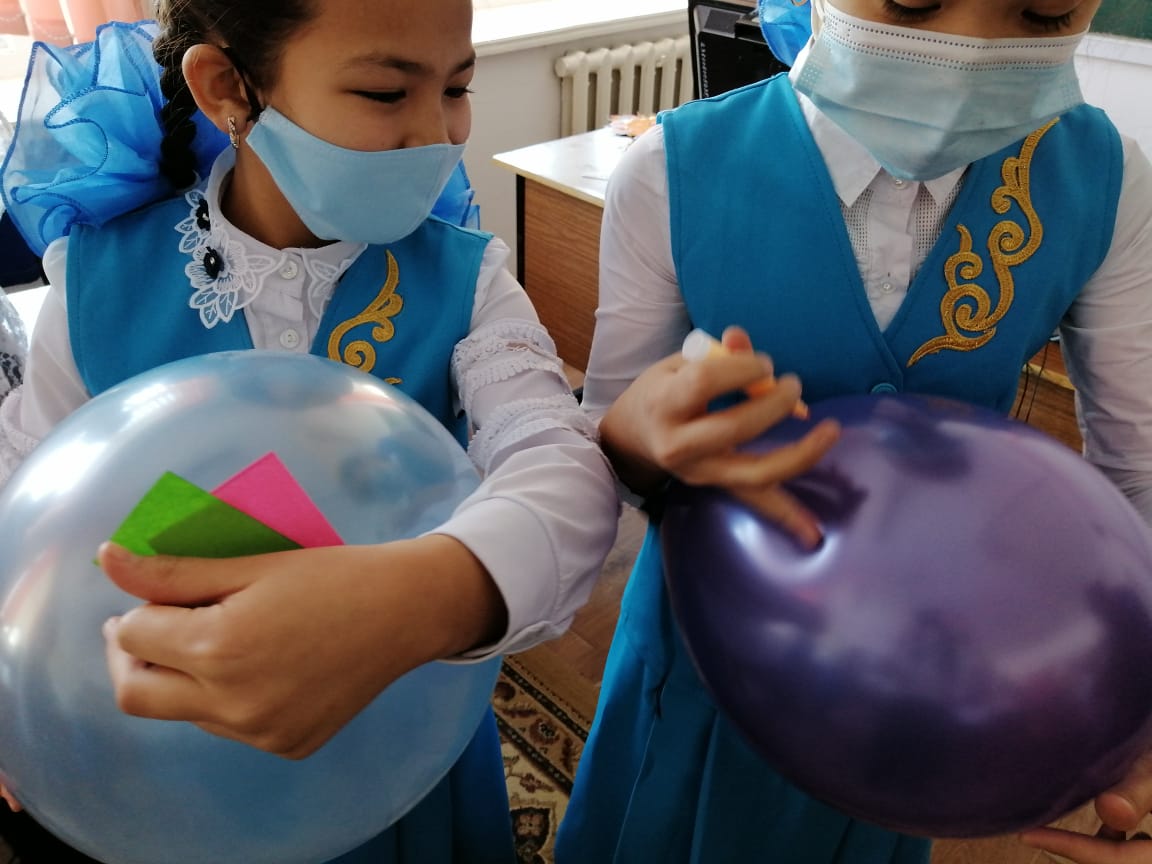 Тренинг соңында оқушылар өз әсерлерін шарларға салып бейнелеп көрсетті.шара соңында сергіту жаттығулары жасалынып, кері байланыс жасалды.
