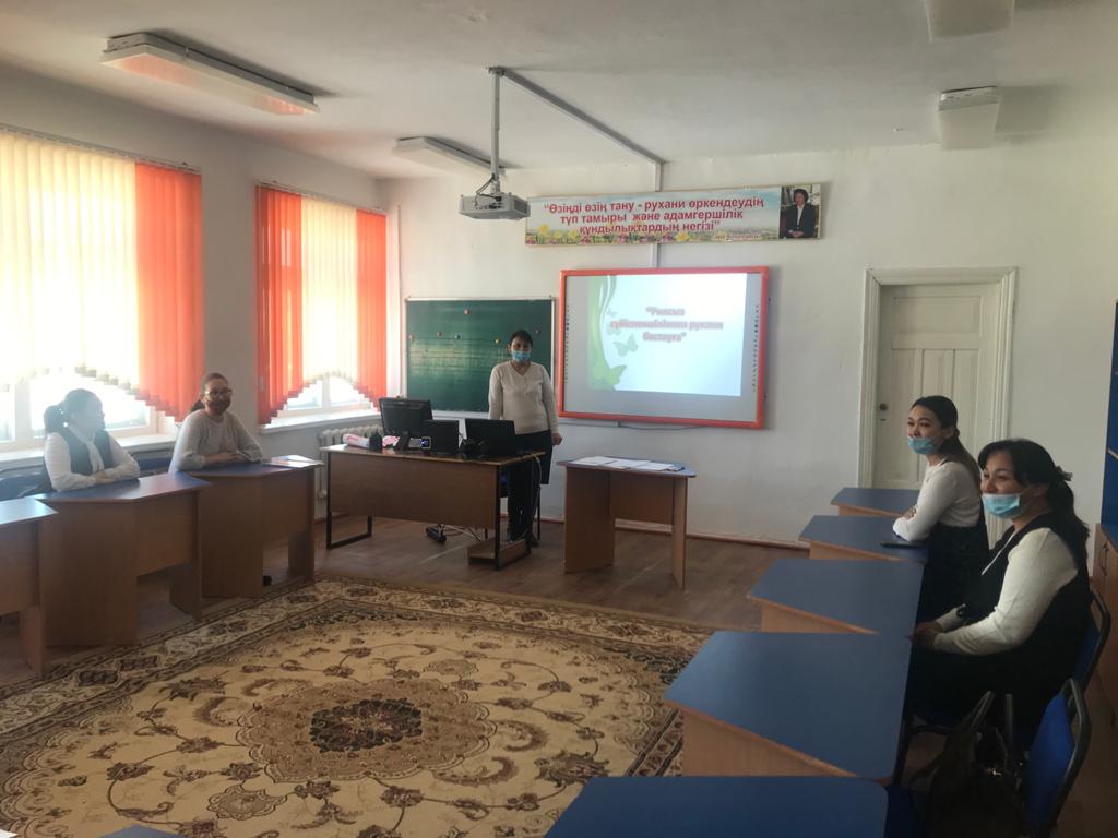 Осы шара аясында «Риясыз сүйіспеншілікпен рухани бастауға тақырыбында Сапаржанова Жазира мұғалімдерге арналған семинар өткізді. Жоспардың мазмұны бойынша «Өзін – өзі тану» рухани – адамгершілік білім беру бағдарламасының психологиялық – педагогикалық түсінік берілді. Мұғалімдерге сананың құрылымымен сана арқылы оқытудың тиімділігі, сананы тазарту жолдарын айқындап көрсетілді. Құндылық туралы түсінік беріліп, абсалюттік жалпыадамзаттық құндылықтардың ережесі айтылды. «Өзін – өзі тану» жалпыадамзаттық құндылықтарды пәндердің мазмұнына интеграциялау түрлері, жолдары түсіндіріліп, интеграциялауға мысалдар келтіріп, түсіндірдірілді. Мұғалімдер жақсы түсініп өз ой – пікірлерін ортаға салды.