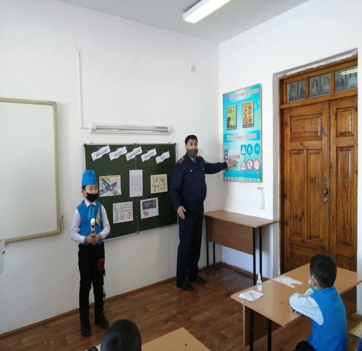 №39"Қызылөзек"орта мектебінде " Жолда жүру ережесін білесің бе?" тақырыбында 1-4сыныптар арасында ауылдық полицияның қатысуымен